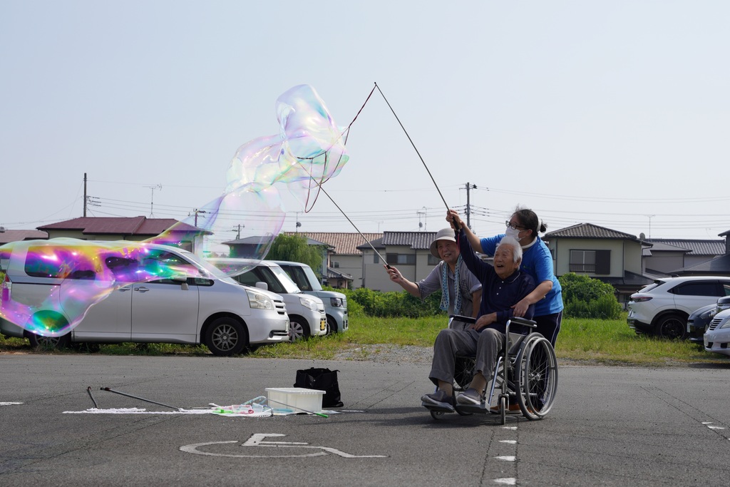様々な大きさのシャボン玉に歓声が止みません。青空にシャボン玉が映えます。