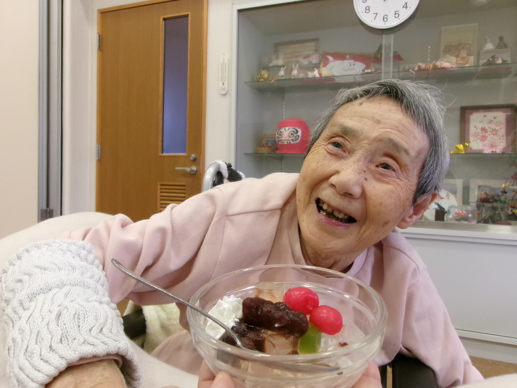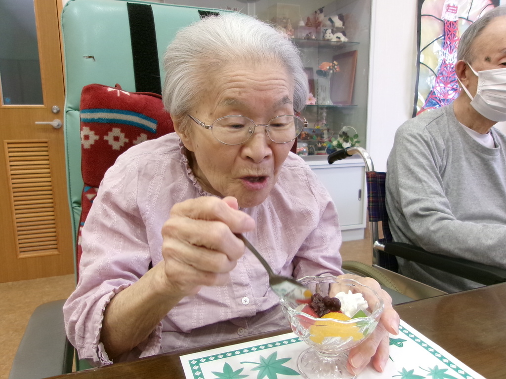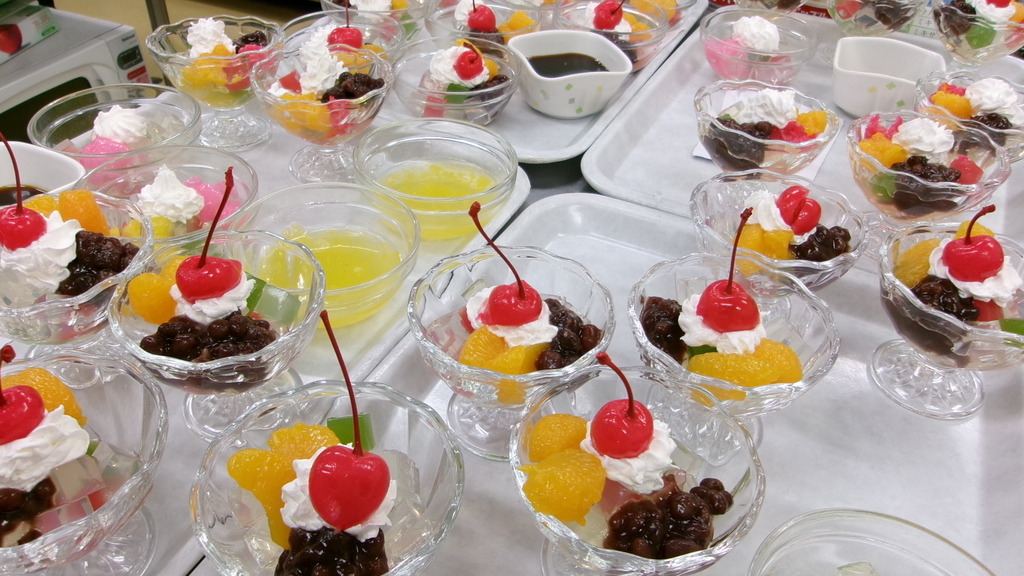 寒天、果物、あんこ、生クリームに黒みつをかけ召し上がります。