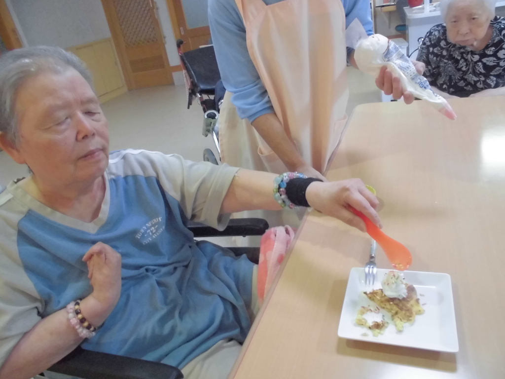 盛り付けをしたらトッピングです。ホイップクリームにチョコスプレーで彩りを。