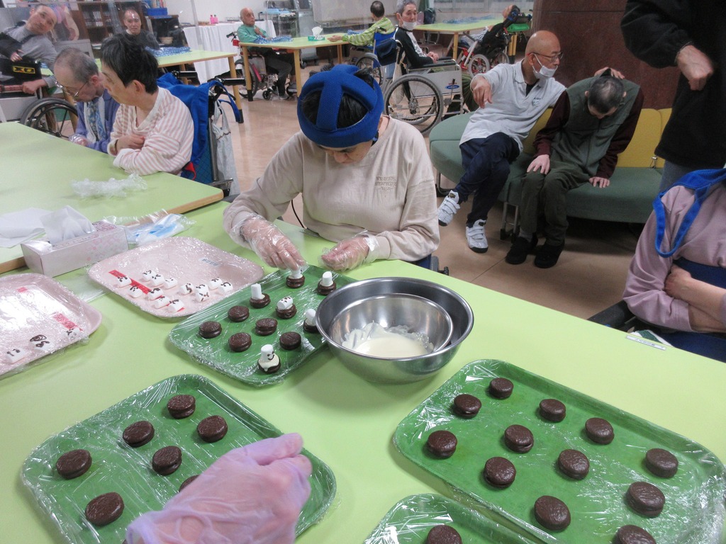 マシュマロにお化けの顔をチョコペンで書きました☻ 職員と一緒に書いてよ チョコパイにさっき作ったお化けを乗せたよ 完成🎃🎃 -
