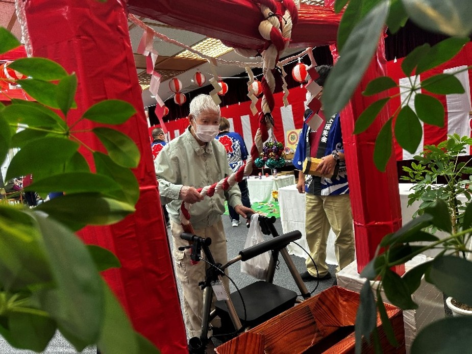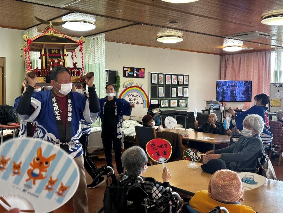 施設長を先頭に、光輝くお神輿を利用者、職員の掛け声でワッショイ!ワッショイ! うちわと手拍子で利用者様のテーブルを練り歩きです。とても賑やかな秋祭りのスタートが出来ました。