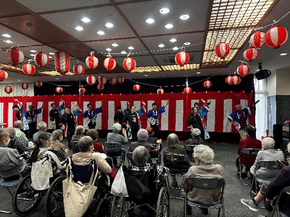 お祭りの最後は職員の踊りです。清水港かっぽれ、青森ねぶたかっぽれ、沖縄エイサーかっぽれ・・施設長も職員も汗だくでした。呼吸を整えるのに必死になりながら利用者の方々を楽しませてくれました。