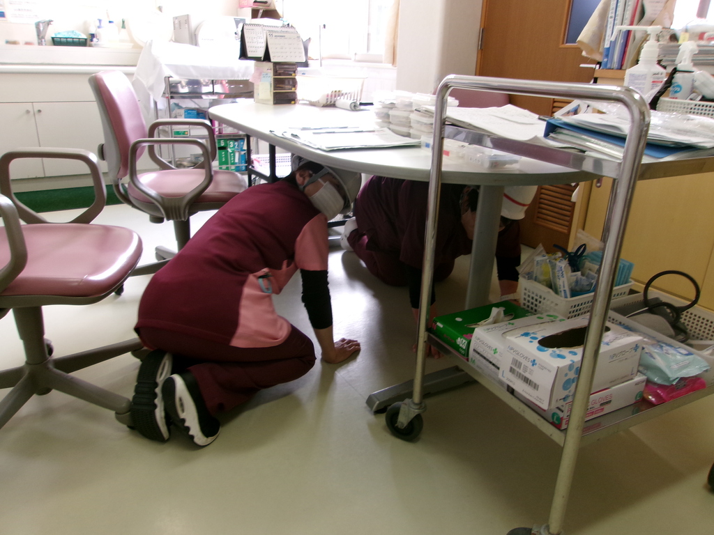 防災訓練!!地震が起きています。訓練と言えども真剣です。頭をしっかり守りましょう。