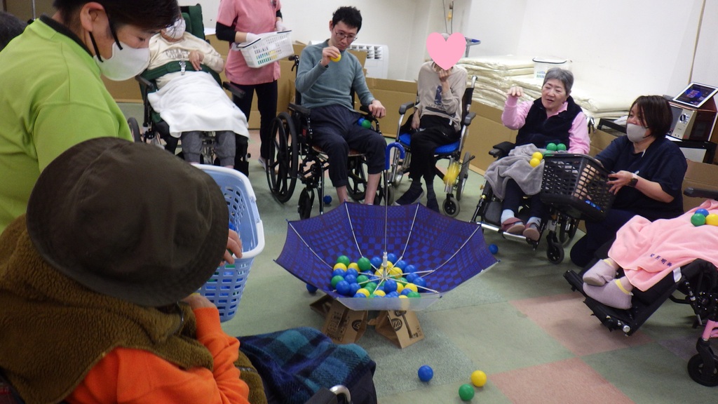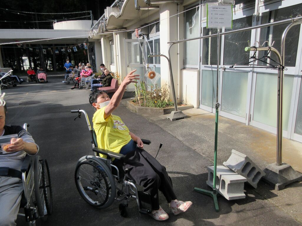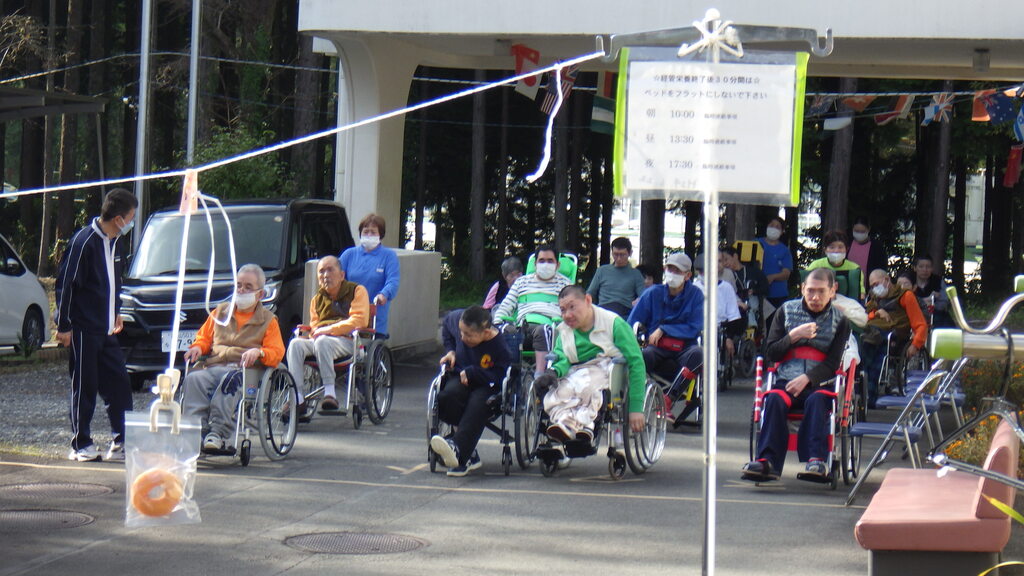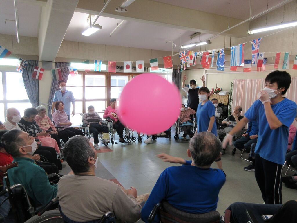 10月28日に秋の大運動会を開催しました。各棟のA棟・B棟・C棟・そよかぜ棟の4チームに別れ、風船バレー・お菓子Getたぜ!玉入れの3競技に挑戦しました。