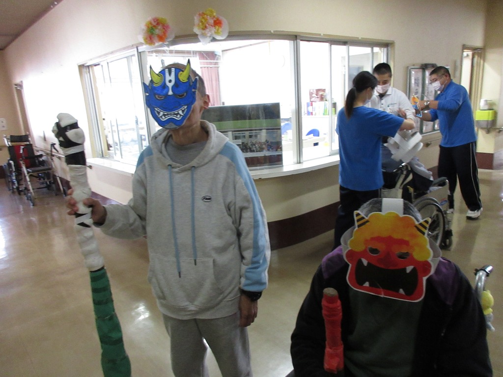 2月3日は節分でしたね。くぬぎの里でも昼食に恵方巻や五目豆を食べ、豆まきをしました。