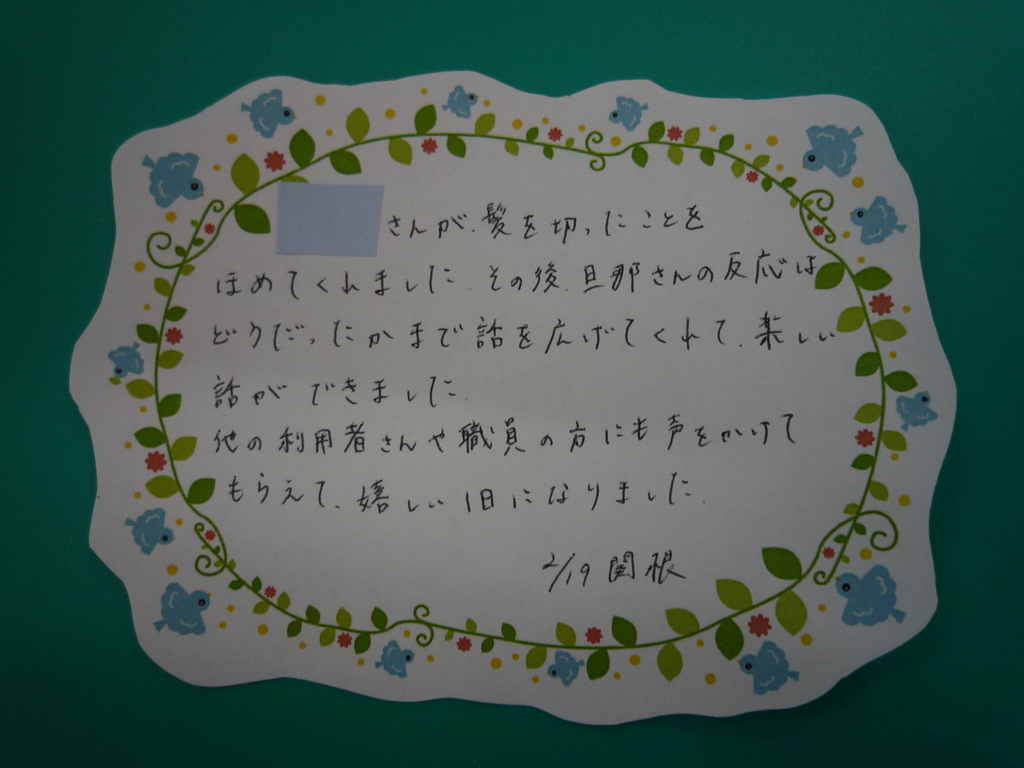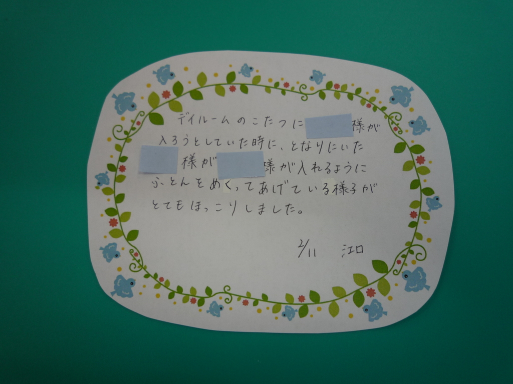 2月のにこりほっとをご紹介します。 最初は利用者様が職員の変化に気付いてくださった話です。 次は利用者様と職員の愉快なコミュニケーションの話です。 最後は利用者様同士のほっこりした話です。 障がい者向け施設 くぬぎの里 ポップサーカス外出 焼き芋作り🍠 関連記事 焼き芋作り🍠 2026年3月 ポップサーカス外出 2026年3月 節分・豆まき 2026年3月 1月のにこりほっと 2026年2月 南部駅伝(くぬぎの里) 2026年2月 繭玉づくり・どんど焼き🍡 2026年2月 第23回南部町駅伝・マラソン大会参加報告 2026年2月 どんど焼き 2026年2月