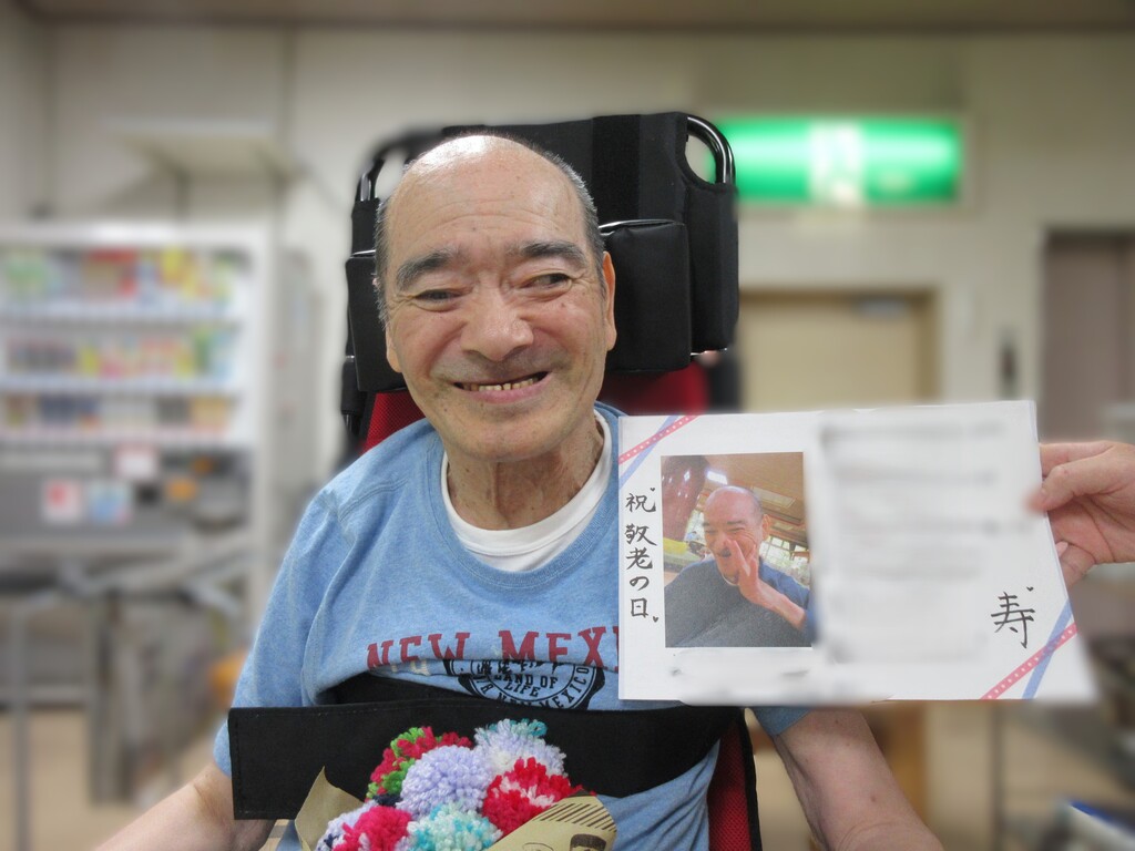 敬老の日のお祝いに職員お手製の利用者様の名前で作ったあいうえお作文の色紙とお花をプレゼントしました♪ これからも健康で長生きしてくださいね! -